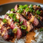 Assemble the Bowls: Add a scoop of cooked rice to each bowl. Top with the steak cubes and drizzle with the spicy cream sauce. Serve warm, garnished with sliced green onions or sesame seeds, if desired.